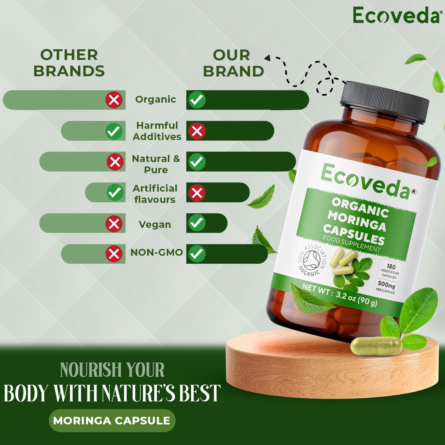 Discover the power of nature with Ecoveda Organic Moringa Capsules, your daily boost of clean, green energy. Sourced from organically grown moringa leaves, these nutrient-rich capsules support vitality, immunity, and overall wellness naturally.
